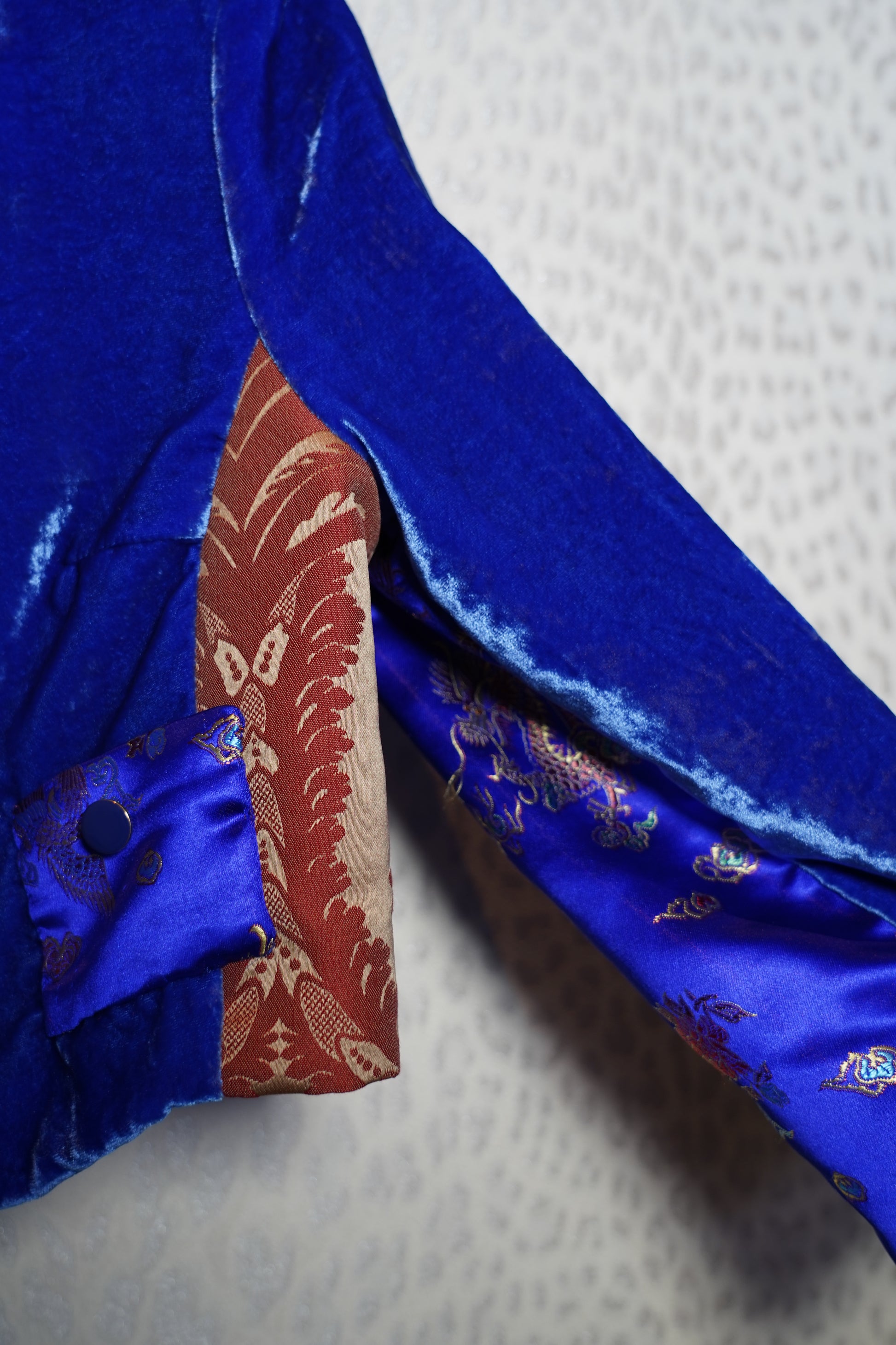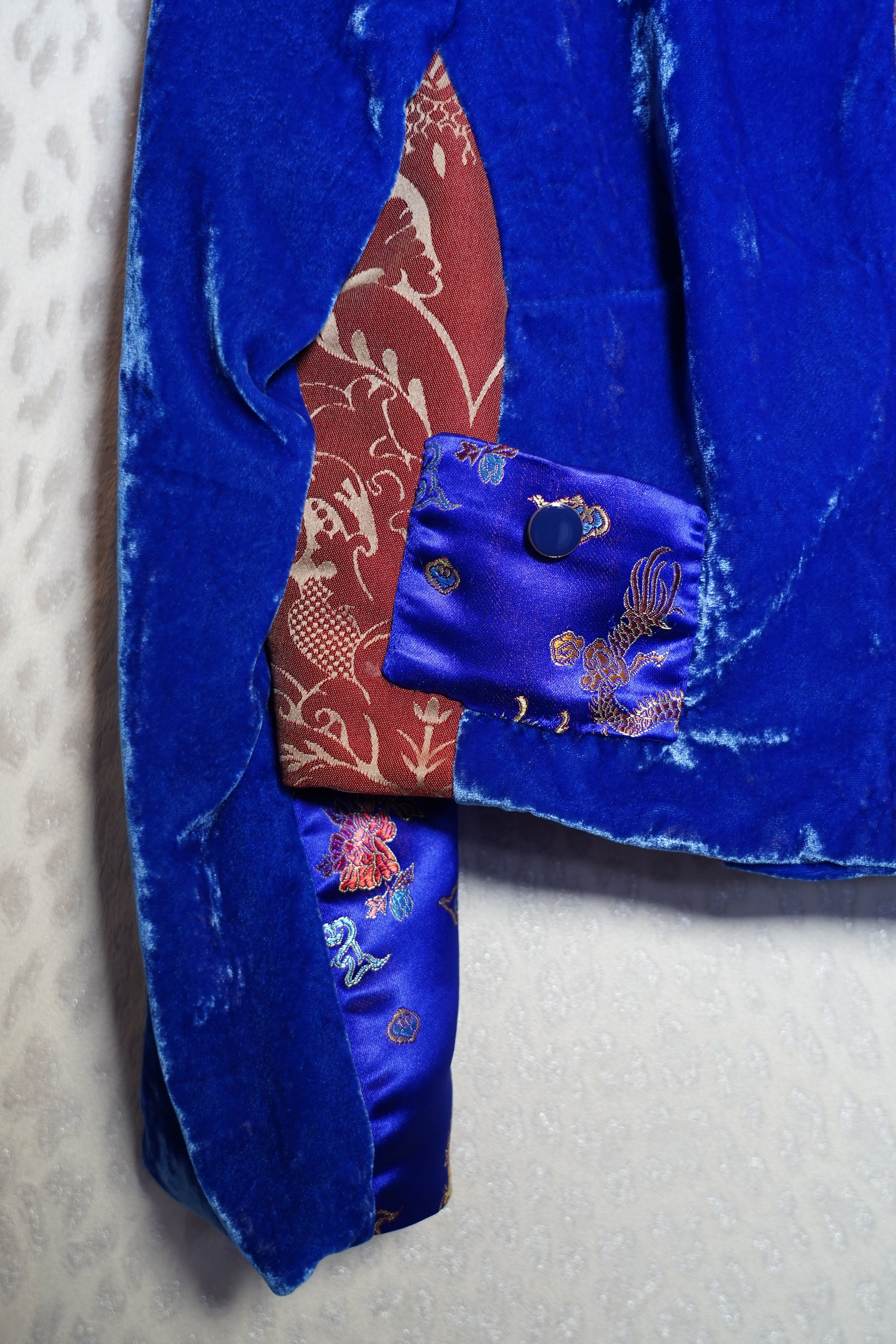 Die ultramarinblaue Samtjacke ist gefüttert aus hochwertigem roten Viskosefutter. Bordeuxfarbende Akzente im Fellkragen und ornamentalen Details. Chinesisches Drachenmuster auf den zwei Vordertaschen und im Unterärmel. Das Unikat ist verfügbar. Kann auf Anfrage nach Wünschen verändert werden.